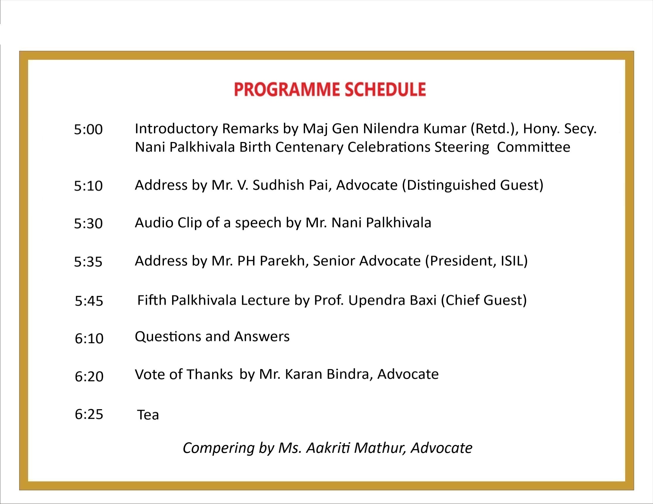 The function will be presided by Mr PH Parekh , Senior Advocate, Supreme Court of India.