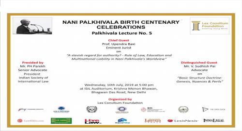 The Sixth Palkhivala Lecture is to be held on Wednesday, 24th July, 2019 at 5pm at Indian Society of International Law (ISIL) Auditorium, Krishna Menon Bhawan, Bhagwan Das Road, New Delhi (Opposite Supreme Court).